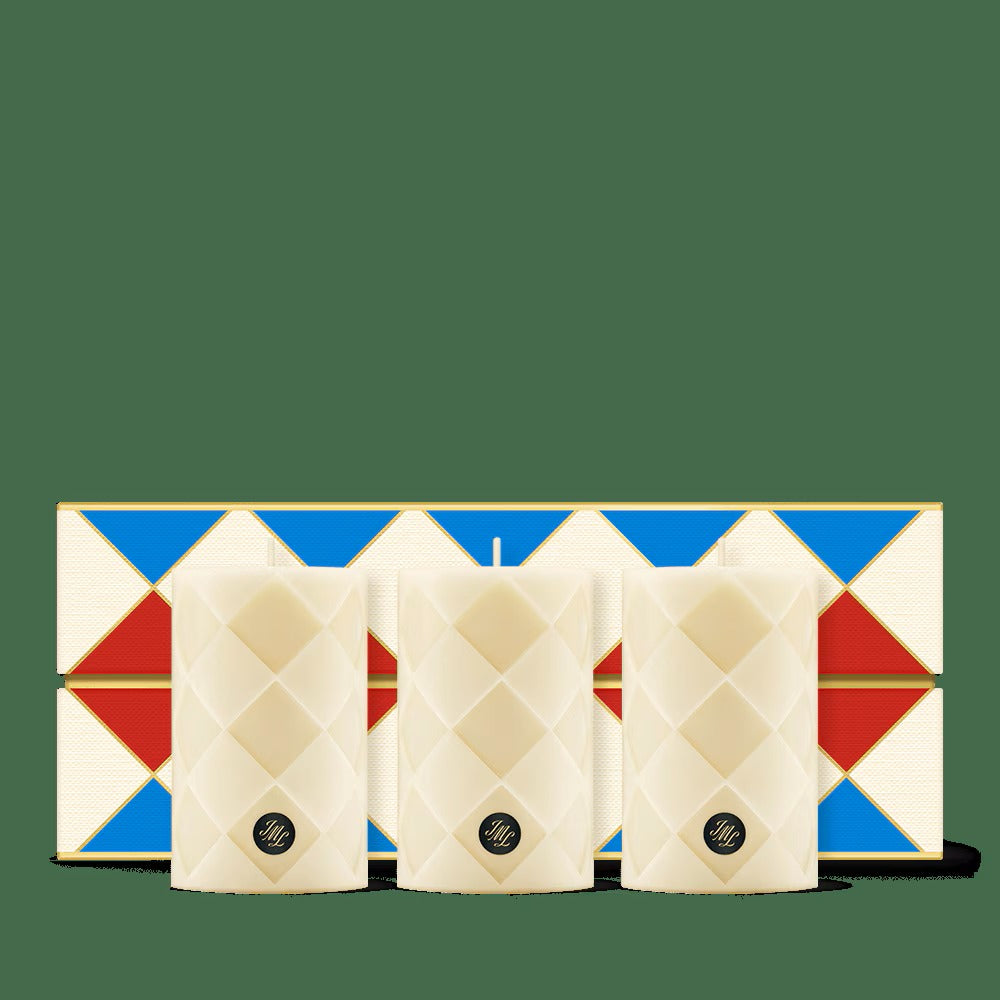 Dress the table for a very merry celebration with a trio of Ginger Biscuit Pillar Candles. A warm spicy scent inspired by just-baked biscuit. Finished with a decorative print and wrapped in a colourful gift box. Burn time approx 28 hours per candle. Total approx dimensions H 9.5cm x W 6cm. Fill weight 235g per candle.