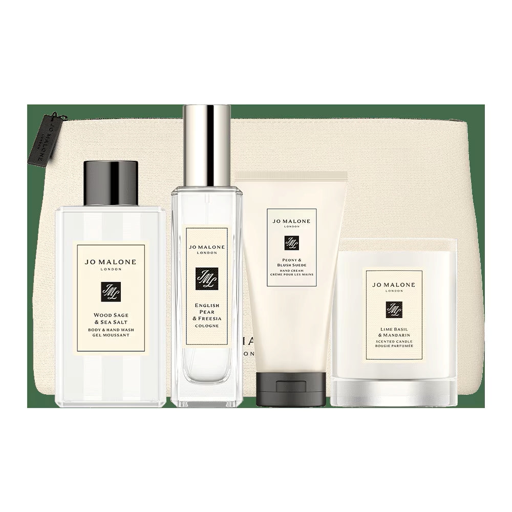 This gift collection contains:English Pear & Freesia Cologne 30mlPeony & Blush Suede Hand Cream 50mlWood Sage & Sea Salt Body & Hand Wash 100mlLime Basil & Mandarin Travel Candle